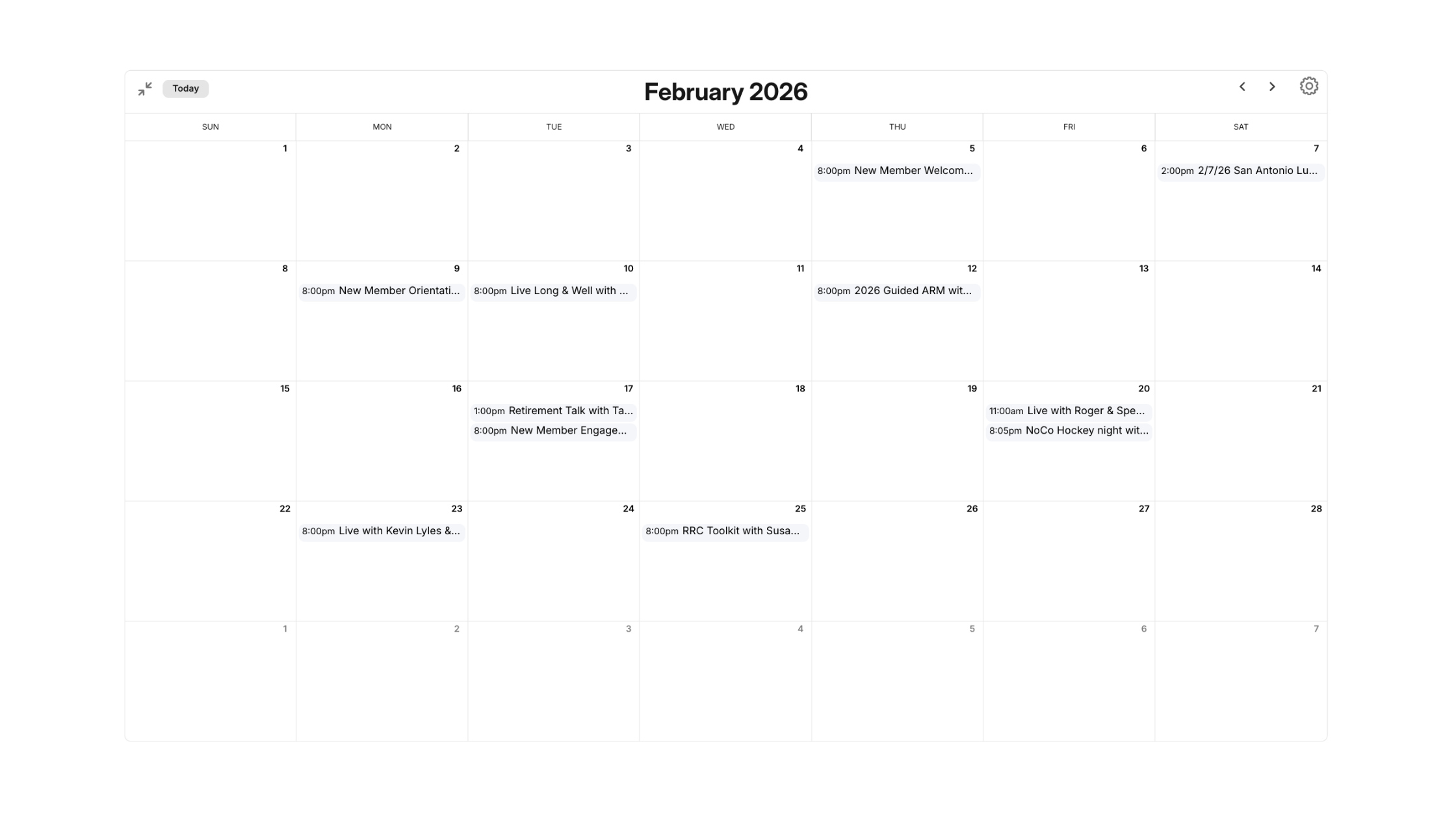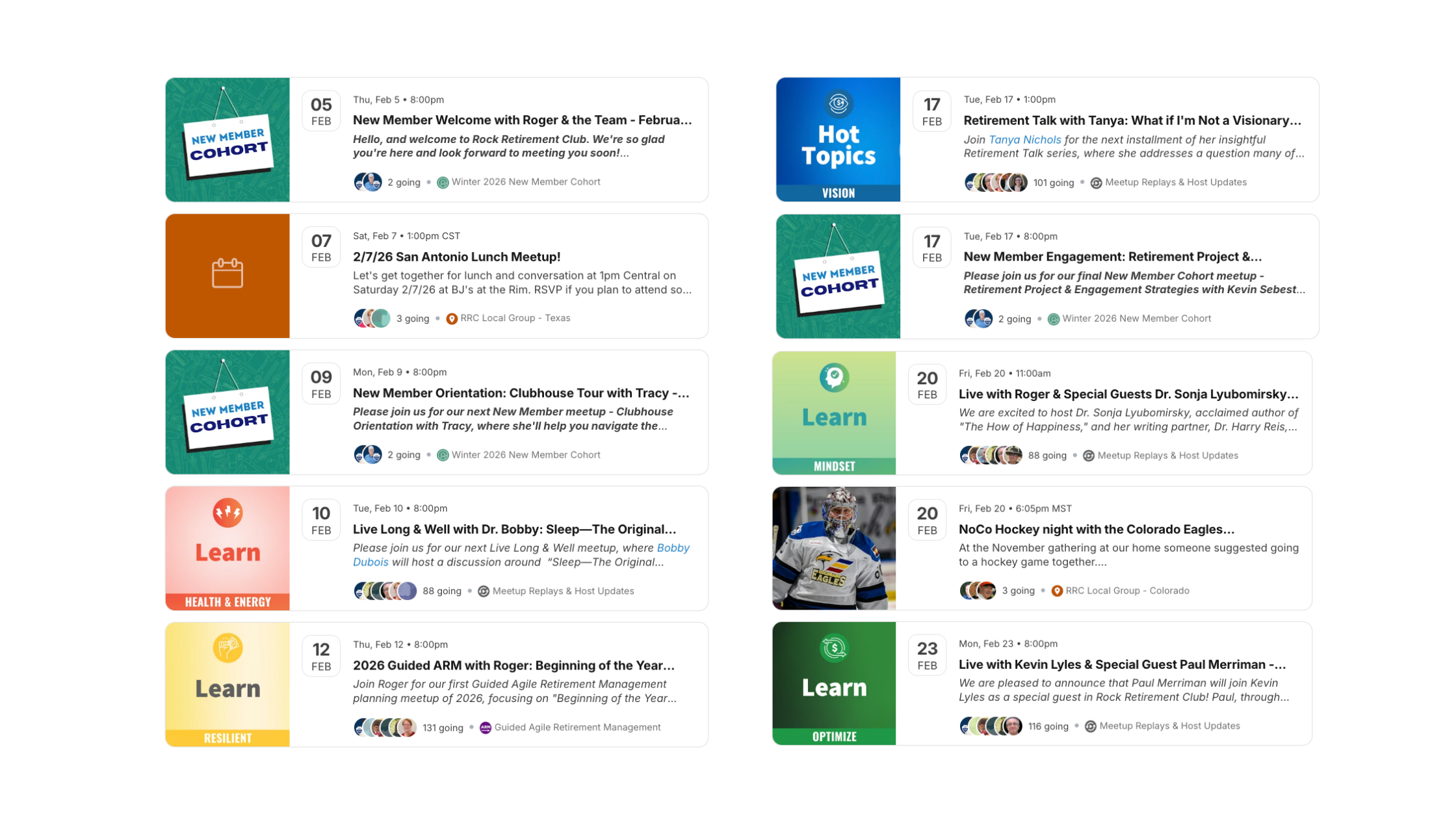 We offer online meetups for our members throughout the year to teach or facilitate discussion around a wide range of topics pertinent to retirees and those with retirement on the horizon.